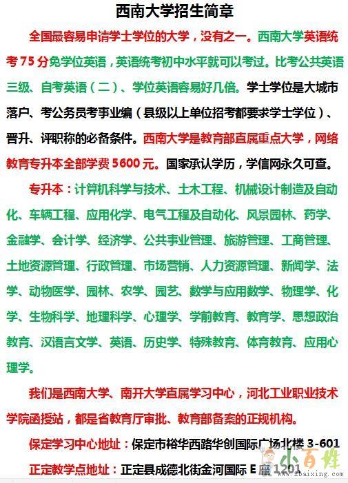西南大学是教育部直属重点大学x~b~a~i~x~i~n~g~c~o~m。专升本39个专业。全部学费5600元。
