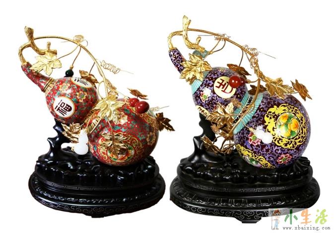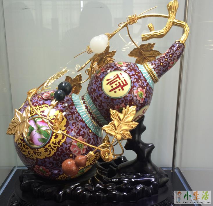 景泰蓝《吉祥葫芦》创作于2016年,高45cm,直径21cm小_生_活_网。葫芦谐音“福、禄”,自古以来被视为吉祥富贵的象征,此作品以葫芦为元素进行创新,金枝玉叶、葫芦满身,将多子多福、长禄长寿、财运常在等多种吉祥寓意融汇其中小~生~活~网。作品以少见的红釉为主色调,寓意红红火火,在大葫芦上以金蔓枝叶挂着各种颜色的小葫芦,寓意福禄万代,通过大师的巧妙设计,作品上大与小、虚与实巧妙组合在一起,表达了人们祈求美好生活的愿望来源www.xbaixing.com。