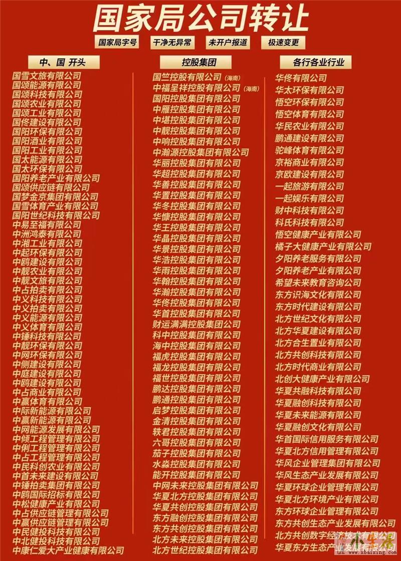 集团公司是作为母公司来经营的来源www.xbaixing.com。当然现在也有很多人用国家局无行业的公司来作为母公司,这类的公司名称一般都比较大气,不受地域限制用起来也方便。所以目前市场上这种公司都是比较受欢迎的!