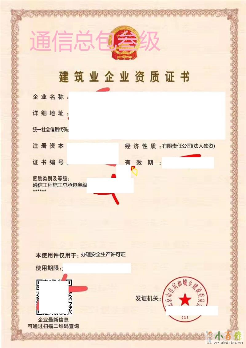 另转让一个通信工程施工总承包叁级的建筑业企业资质来自www.xbaixing.com。