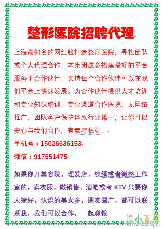 沪上网红整形医院,招整形代理,男女皆可,永久合作,高薪提成,月收入十万以上,想跳槽的私信我,做了代理就是我院员工,员工整形享受半价优惠, 美容院,理发店,美甲店,半永久工作室,网红资源等都可以!
