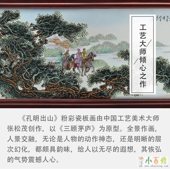 《孔明出山》瓷板画是由张松茂大师倾情创作,以其首度创作的《三顾茅庐》为原型,首次将这个题材在瓷板上进行立体创作小 百 姓 网。作品场面宏大且视觉中心突出,生动形象地反映了刘备、关羽,张飞历经风雪,坚韧不拔,三顾茅庐请孔明出山共谋霸业的可贵精神,既符合历史又充分调动了多种文化元素的寓意,人物刻画于极细微处表达强烈的情感因素,笔触雄浑,意境深远,充分表现出春天的美景,描绘的人物各具情态,趣味盎然,给人以一种划时代情景交融的美好联想,具有极佳的艺术效果x_b_a_i_x_i_n_g_c_o_m。