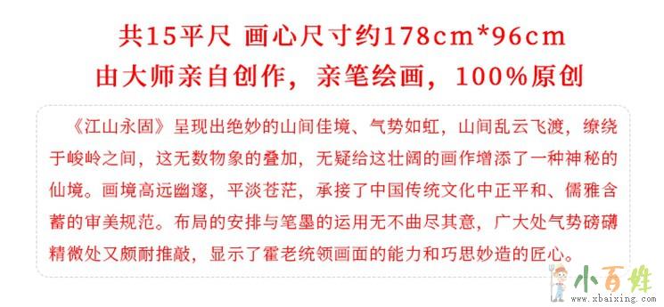 《江山永固》呈现出绝妙的山间佳境、气势如虹,山间乱云飞渡,缭绕于峻岭之间,这无数物象的叠加,无疑给这壮欢迎www.xbaixing.com阔的画作增添了一种神秘的仙境。画境高远幽邃,平淡苍茫,承接了中国传统文化中正平和、儒雅含蓄的审美规范。x_b_a_i_x_i_n_g_c_o_m布局的安排与笔墨的运用无不曲尽其意,广大处气势磅礴精微处又颇耐推敲,显示了霍老统领画面的能力和巧思妙造LFg的匠心。x+b+a+i+x+i+n+g+c+o+mxbaixing.com