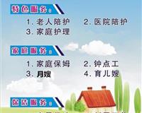 服务范围: 1、居家保姆:家务、洗衣、做饭、照顾老人、病人护理、接送孩子,带小孩。 2、月嫂:产褥期护理,新生儿护理,日常家庭保洁整理,一日三餐。 3、育儿嫂:婴儿营养配餐,婴幼儿日常护理,婴幼儿智力开发,家庭日常护理。 4、普通保洁:新居开荒、日常保洁地板打蜡、擦玻璃。..